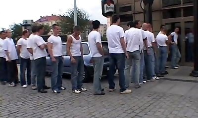 Slutty brunette screwed hard by 30 men in this gangbang film