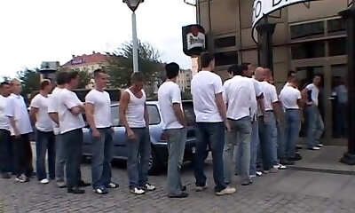 Slutty brunette screwed hard by 30 men in this gangbang film