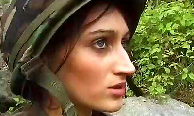 Gross brunette Major Dita gives double blowjob to two kinky soldiers in MMF sex clamp